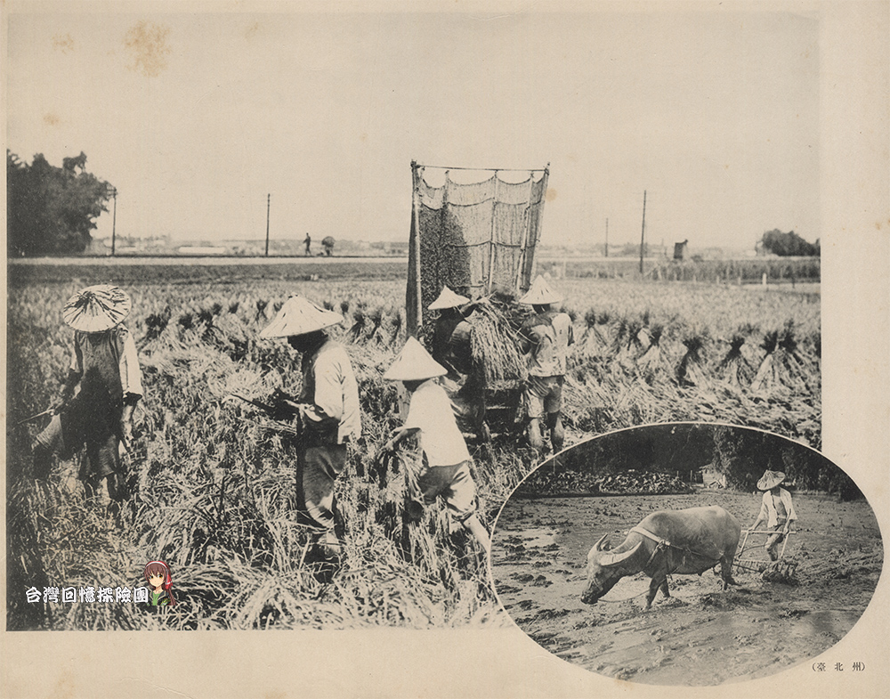 印象中小時候還能在鄉下看到水牛犁田,現在不知道還有哪裡有這種景觀…。有一點比較好奇的是,照片上有兩位農夫正把稻穗塞進一台謎樣的機器(載具?)裡,那是什麼呢??