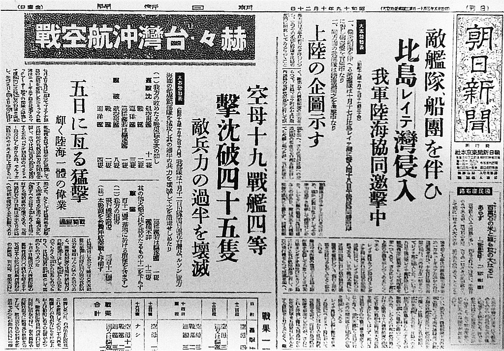 圖為1944年10月朝日新聞報導,日方嚴重錯估戰果(美方實際僅2艘巡洋艦嚴重受損)。
